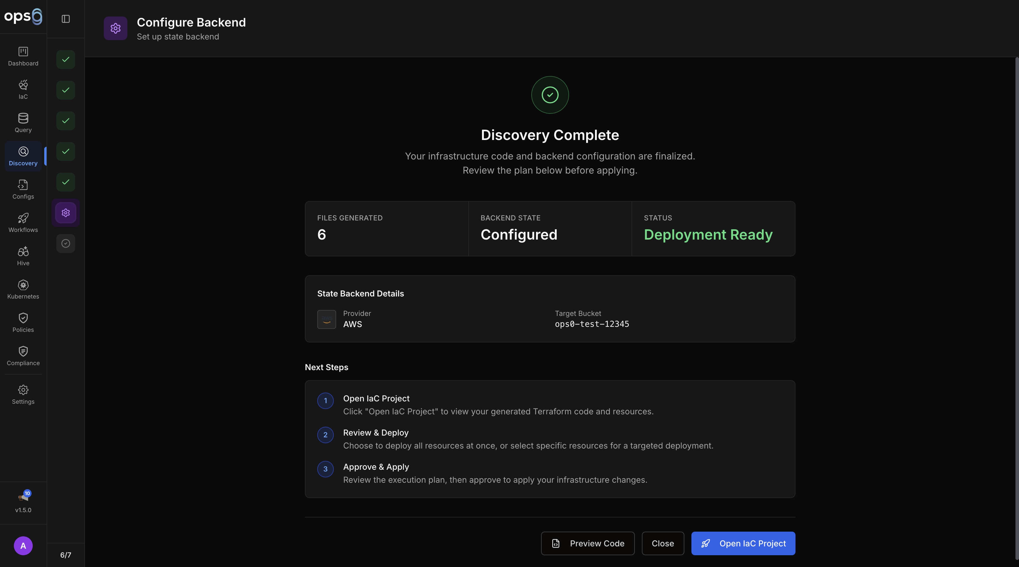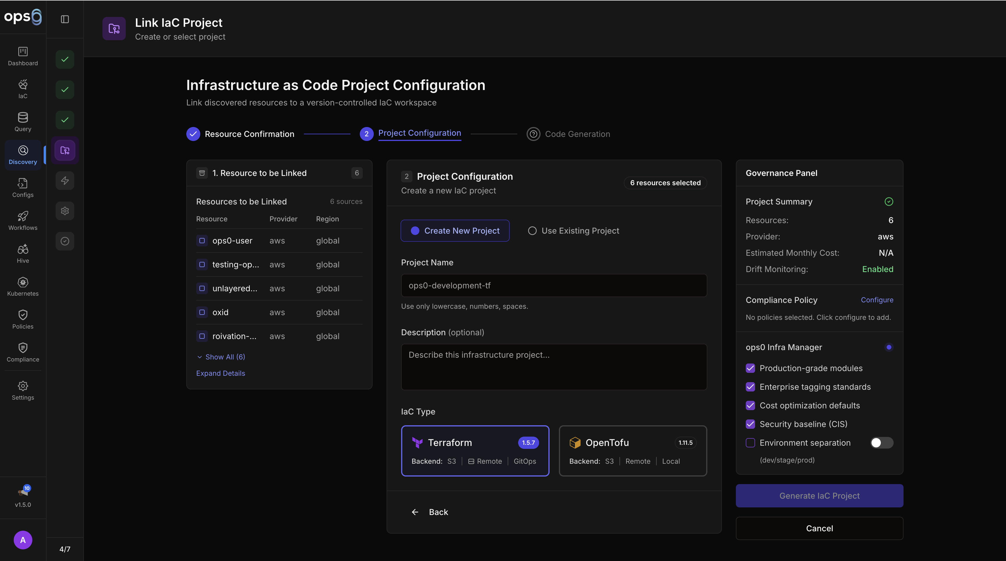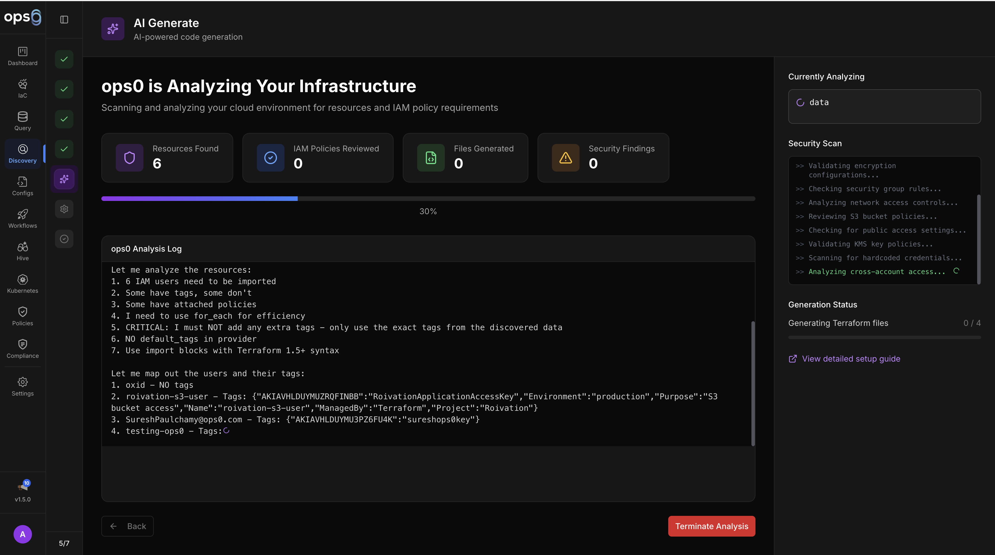 After scanning, generate Terraform code for discovered resources and import them into IaC management. ops0 supports AI-assisted and direct code generation with multiple output formats.