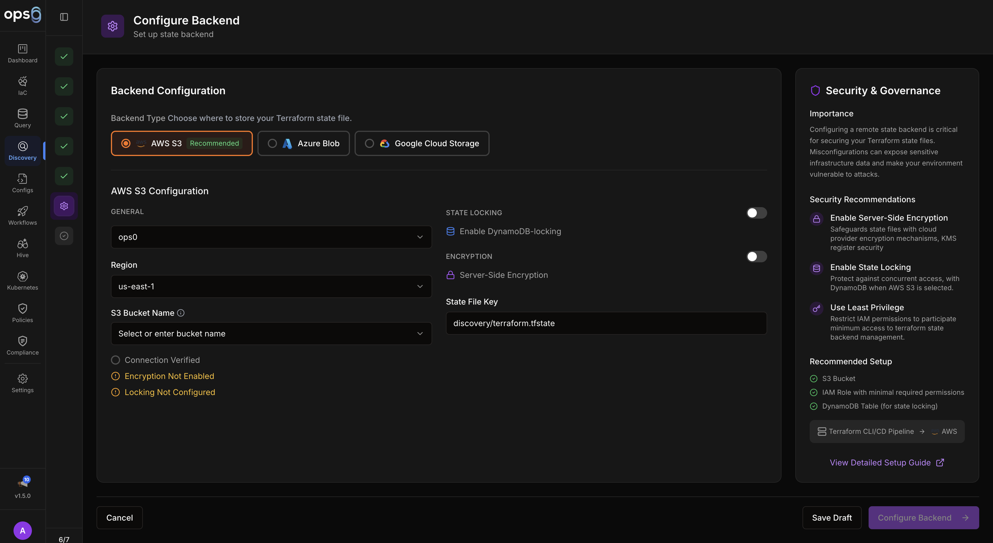 Set up the Terraform state backend (S3, Azure Blob, GCS, or local).
