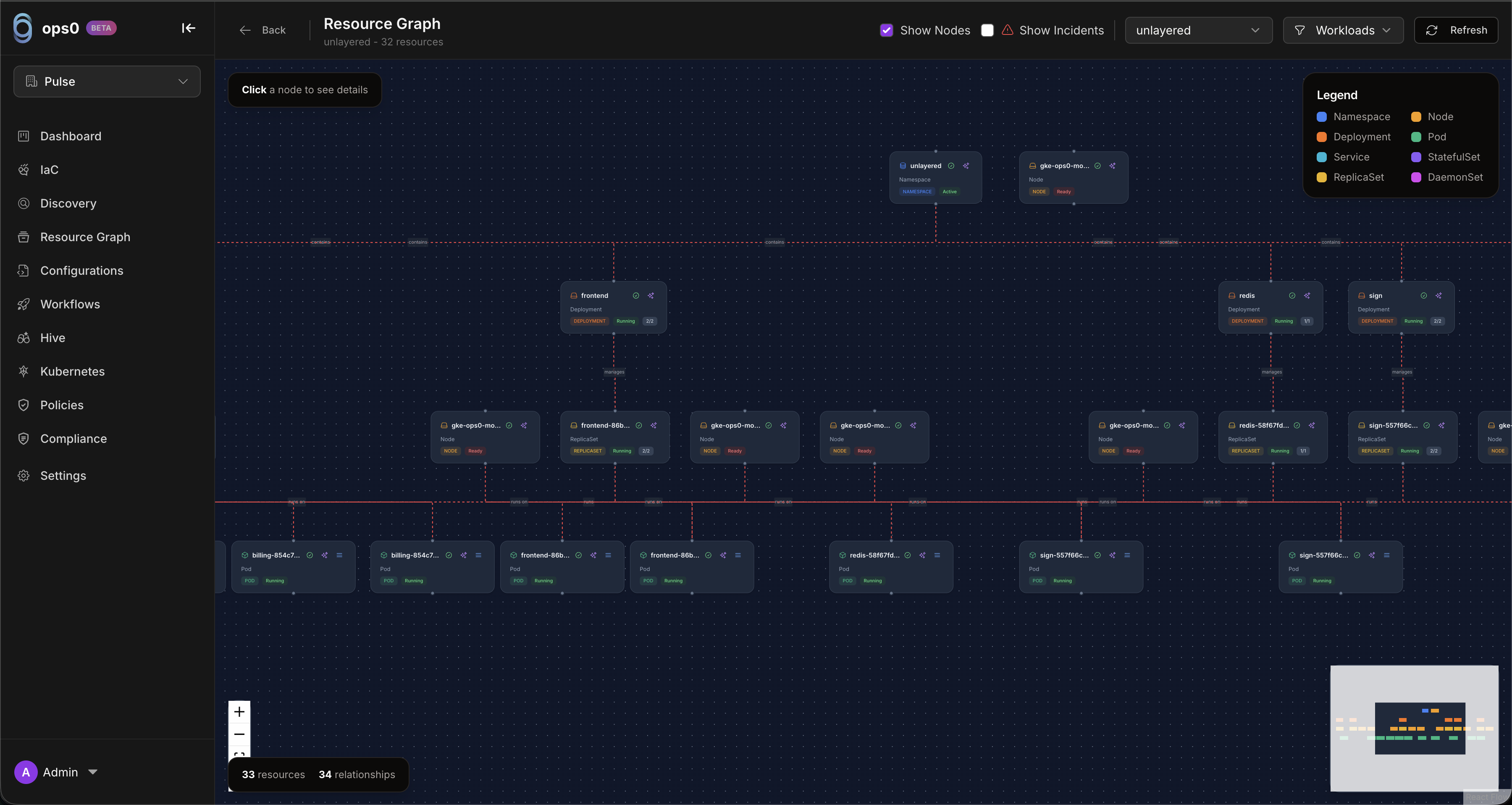 ops0 provides a unified view of all your Kubernetes clusters with real-time monitoring, incident detection, and AI-assisted troubleshooting. Connect clusters via the Hive agent and get instant visibility into workloads, resources, and issues.
