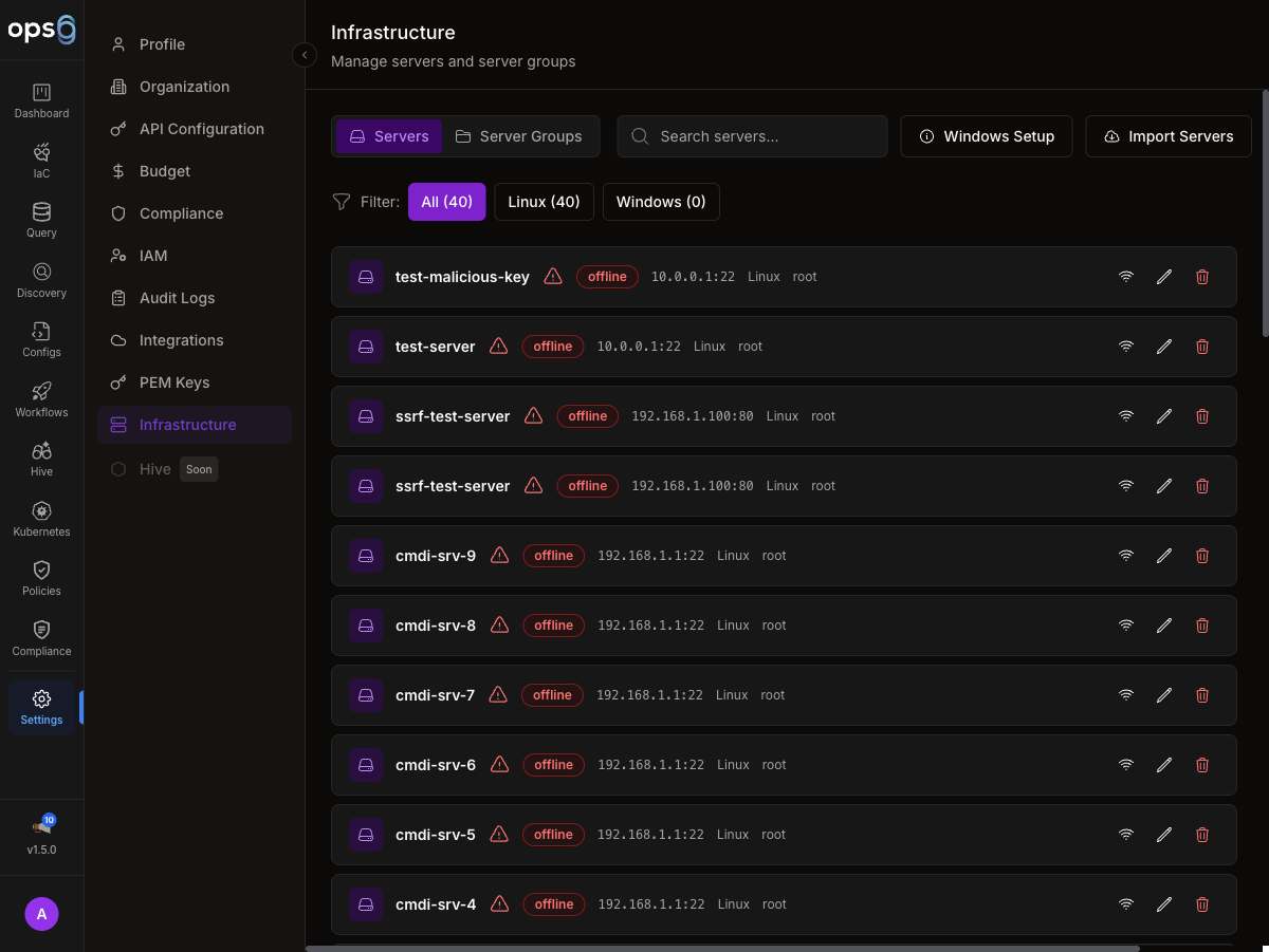 - Import: Upload CSV or JSON file with server details