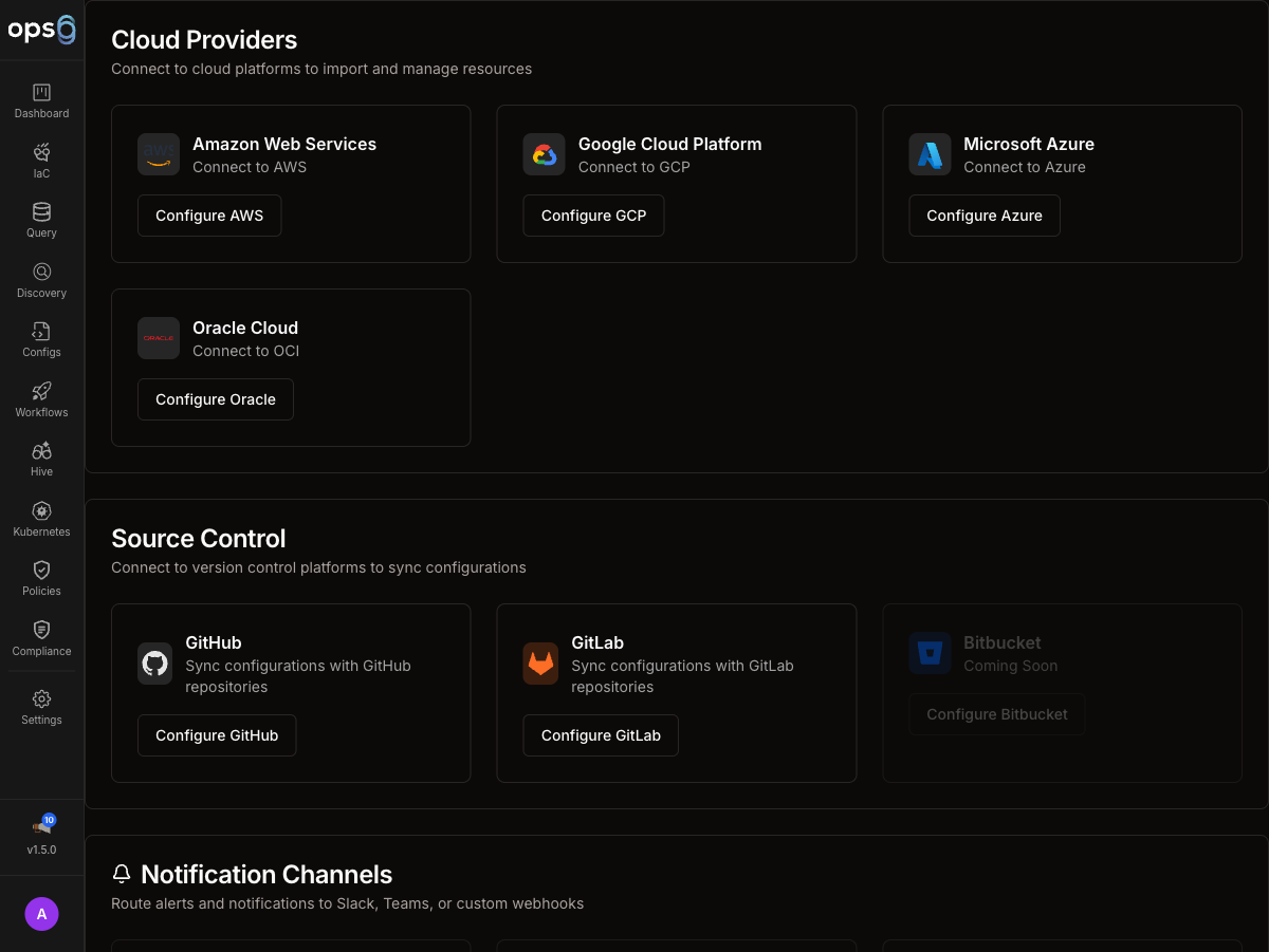 Connect cloud providers, version control, observability, and alerting systems to ops0. Integrations let brew.ops0.ai discover resources, run deployments, sync code, and send operational signals into the tools your teams already use.