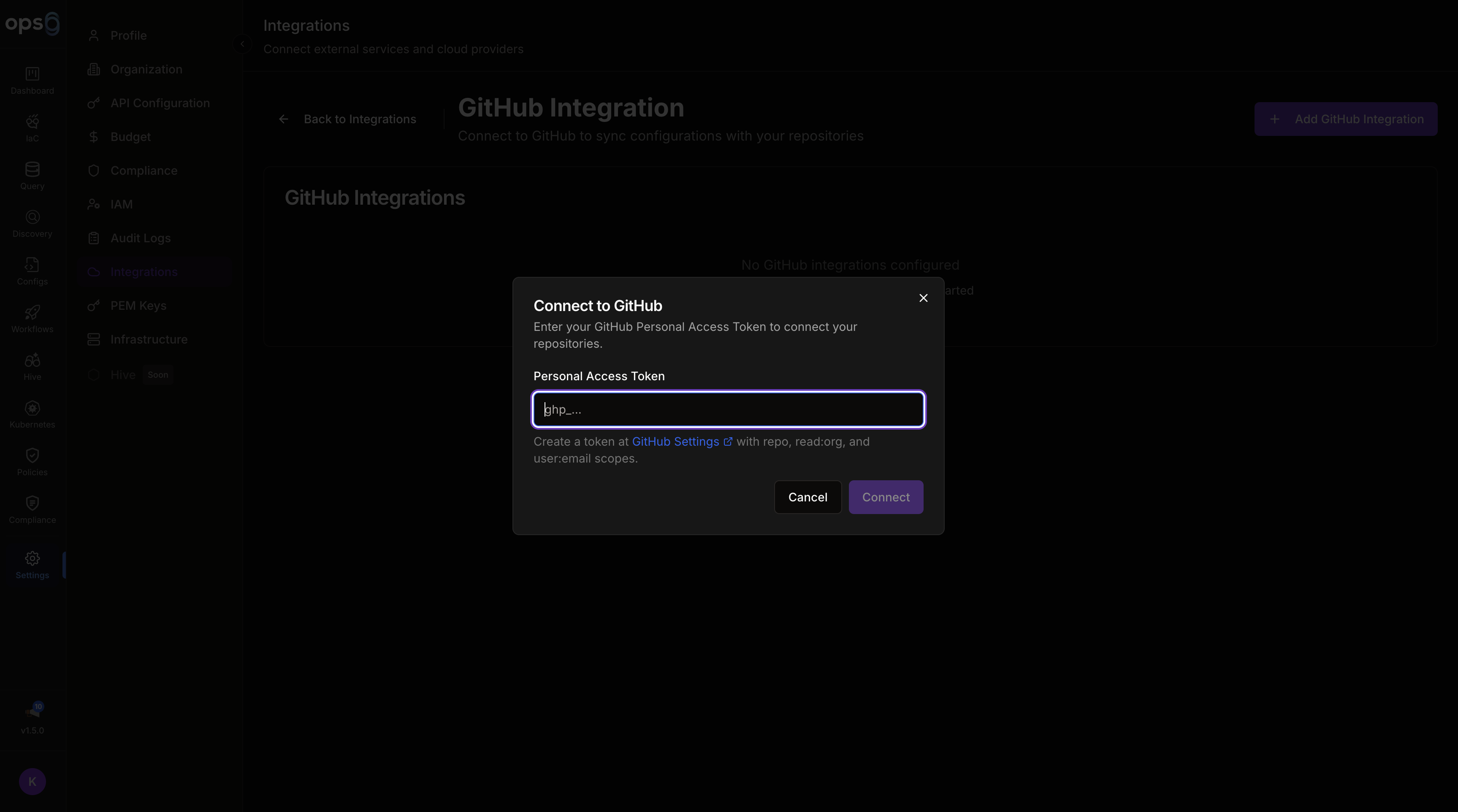 ops0 connects to GitHub to sync IaC projects, open pull requests, manage repository access, and support Git-based workflows directly from brew.ops0.ai.